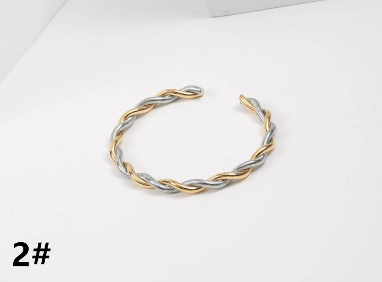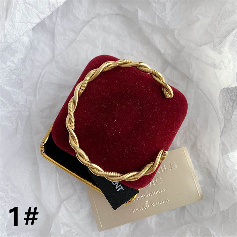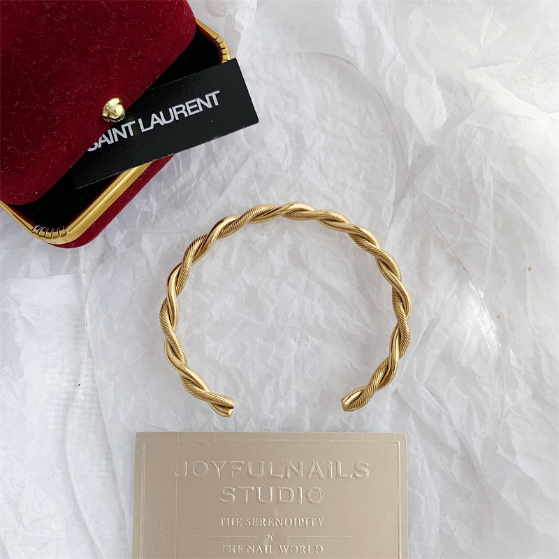 大人かわいい雰囲気に仕上げたゴールドのツイストバングル。