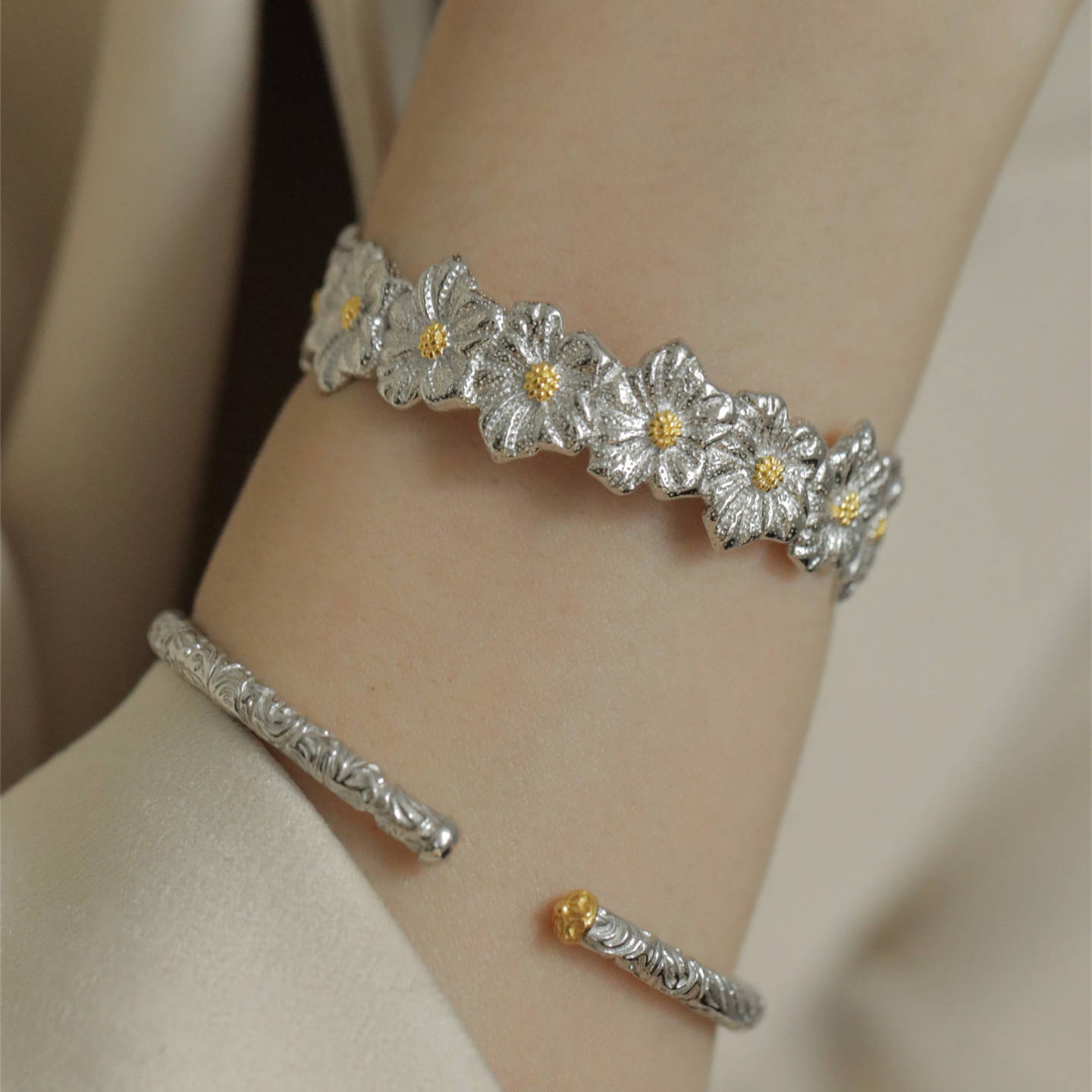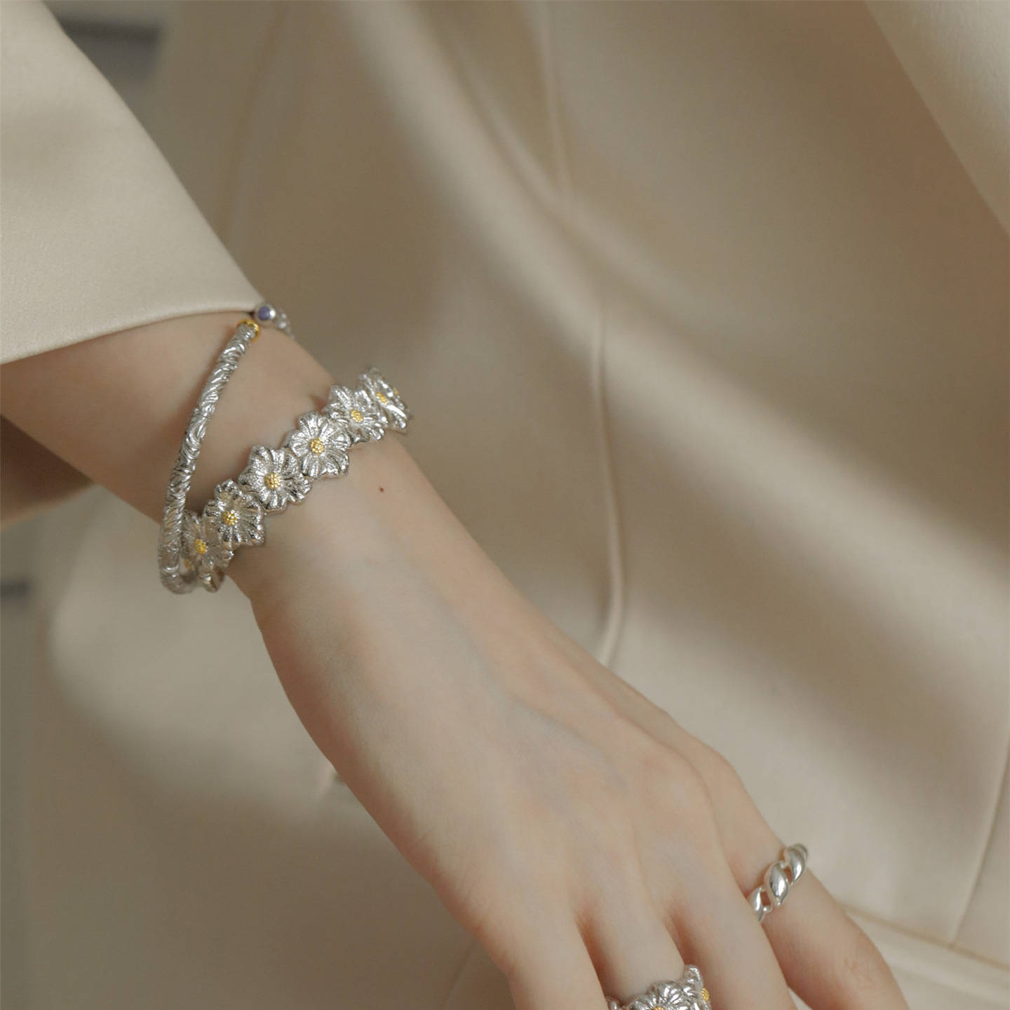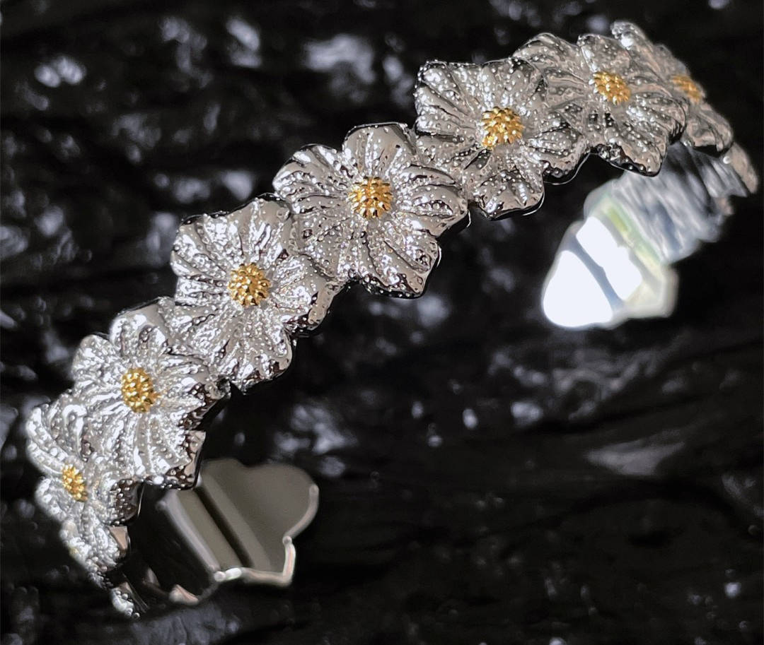 大人かわいい雰囲気に仕上げたシルバー製の花モチーフブレスレット。