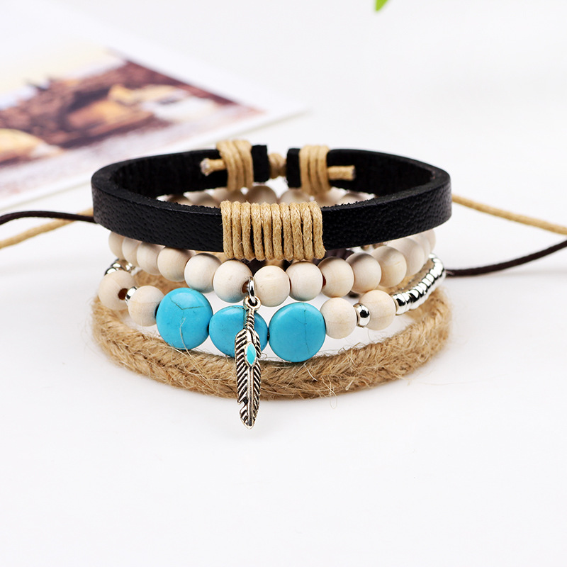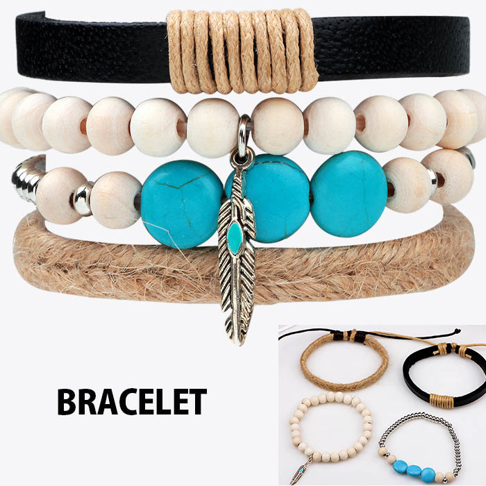 ■コメント アンティーク調シルバーのフェザーモチーフに、ターコイズ調ストーン、ホワイトバッファローを模したストーン。 随所にネイティブなモチーフを散りばめたブレスレット。 アジャスター付でサイズ調節もしやすく、ストーンタイプはゴムテグスで楽ちん着脱。 ■サイズ(単位:cm) 全長:約20cm ■カラー 商品画像に記載 ■重さ 22g ■素材 合皮、合金など ■生産国 中国