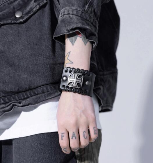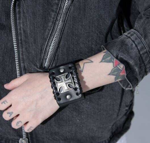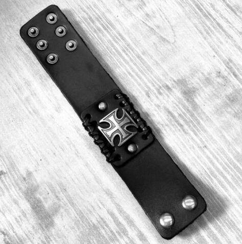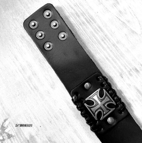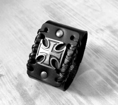 個性的な十字架デザインが印象的な黒革バングルです。