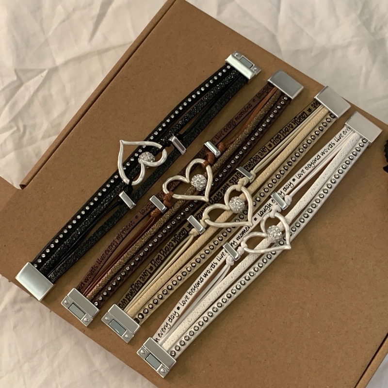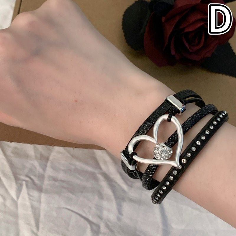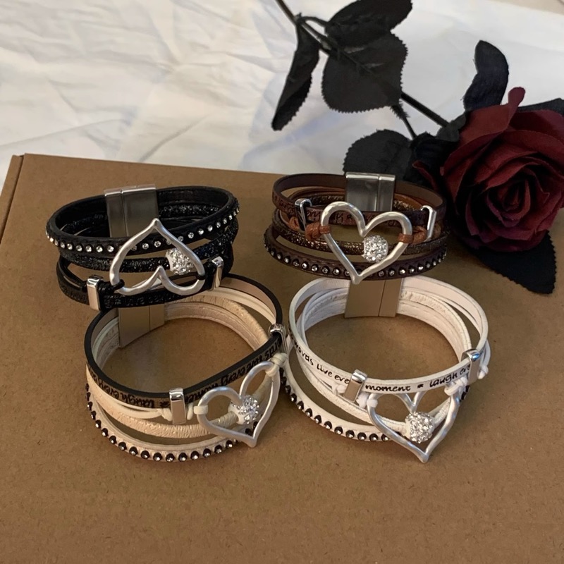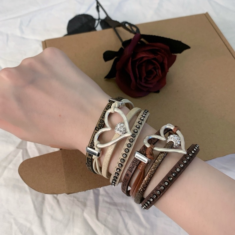 大量生産で作られたレディース用バングルです。ハート形の装飾とスタッズがあしらわれた重ね付け風の魅力的なデザインが特徴。